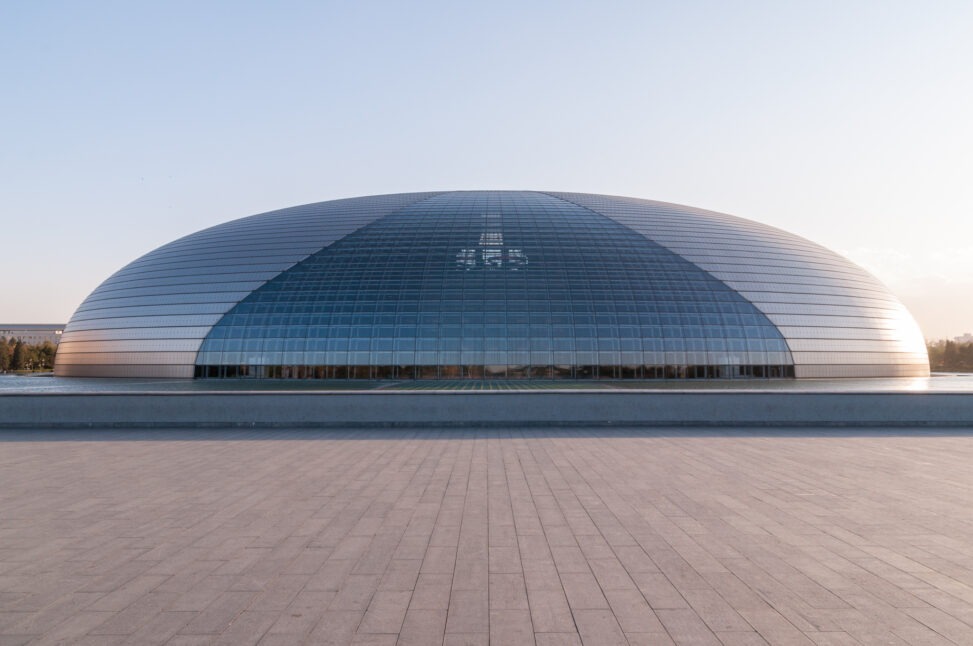Splendide symétrie et beauté des lignes. Le titane constituant le dôme donne un rendu très doux et velouté au bâtiment, renforcé par la belle lumière dorée du soleil.
