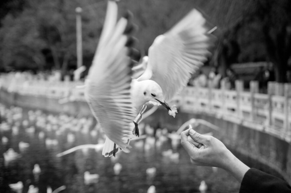 À défaut d’être parfaitement nette, cette photo fige l’instant où la mouette arrache un fragment de pain. Initialement en couleur, j’ai préféré basculer en noir et blanc afin d’ôter le superflu dans l’image, notamment les personnages colorés à l’arrière-plan.
