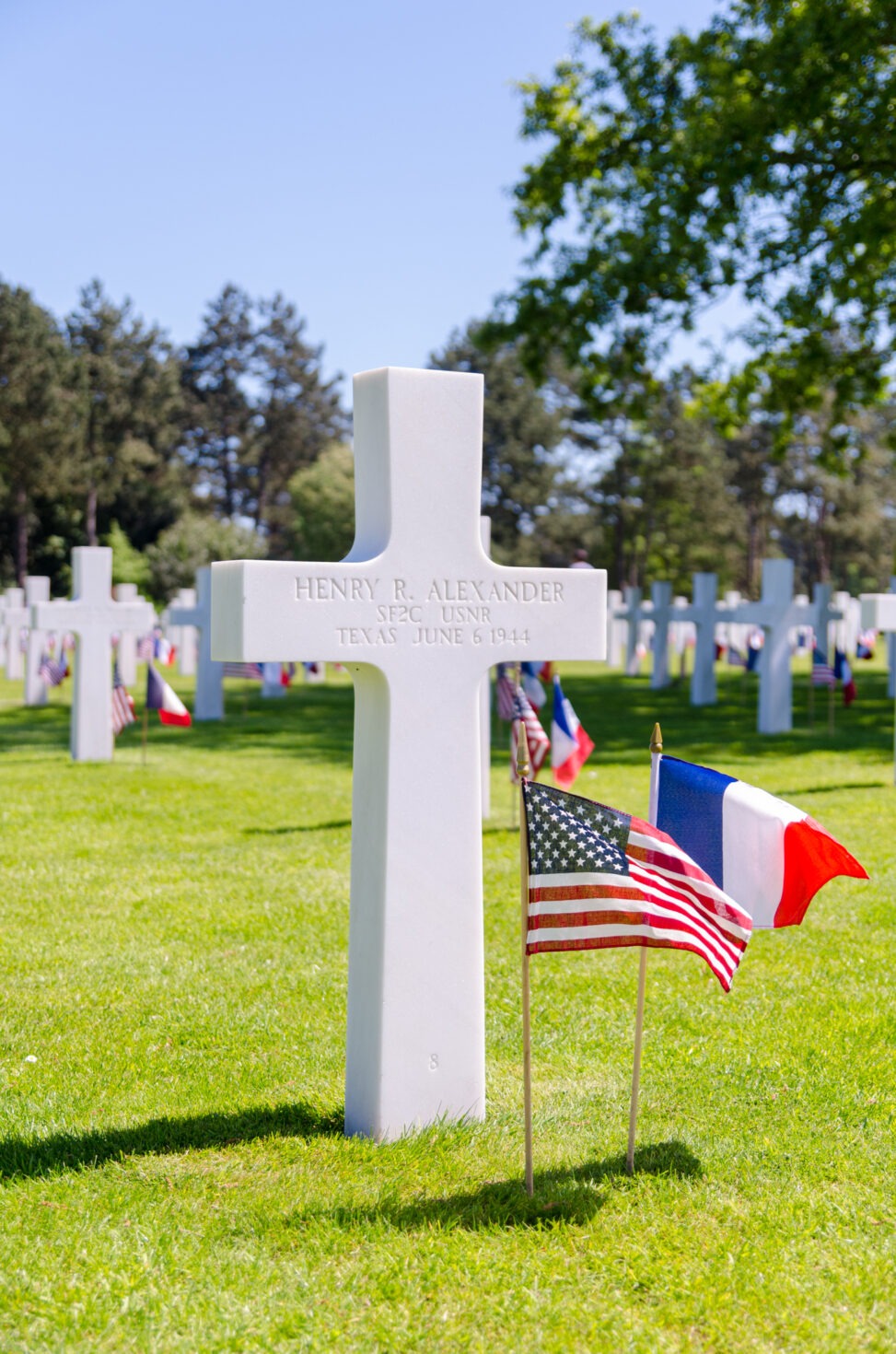Emouvant spectacle que de contempler cette infinité de tombes de marbre blanc au cimetière américain de Colleville. 9 386 personnes y reposent, principalement tuées lors du Débarquement du 6 juin 1944 comme Henry R. Alexander, Shipfitter 2nde Classe dans l’United States Navy Reserve.
