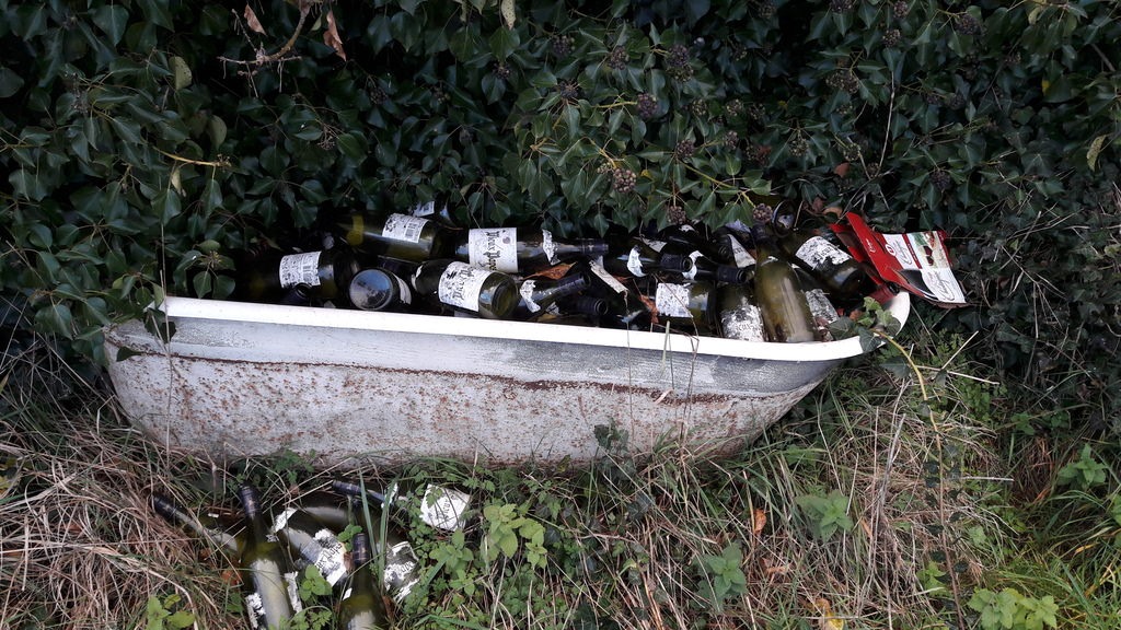 Cela m’a rappelé une découverte similaire faite quelques années plus tôt dans un champ situé derrière l’abbaye d’Ardennes à Saint-Germain-la-Blanche-Herbe (périphérie de Caen). Contre une haie gisait (gît peut-être toujours) une baignoire débordant de bouteilles en verre. À bon entendeur.