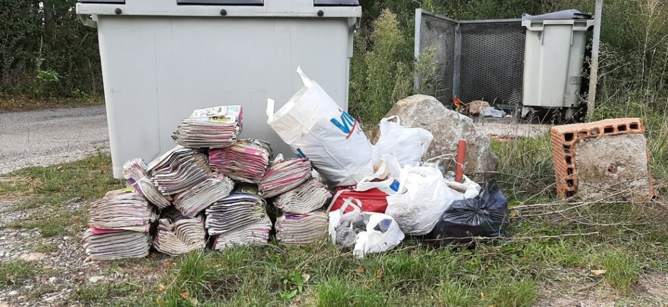 Constatant que les alentours de la Madone étaient jonchés de déchets et détritus, je suis venu un après-midi avec pour objectif de nettoyer le site. Avant ce jour, j’aurais été bien incapable de deviner l’étendue de ce que j’allais trouver sur place. Aux traditionnelles cannettes en aluminium et bouteilles en plastique (nombreuses toutes deux), j’ai récolté au pied de la Madone toute une collection de bonbonnes XXL de protoxyde d’azote, de ballons de baudruche et de récipients en plastique. En déroulant petit à petit la pelote de laine, furetant ça et là, ma quête m’a amené à découvrir ce qui avait dû servir comme emplacement de fête nocturnes avec son lot déchets, canettes et préservatifs rouges (qui donc utilise cette couleur ?!). Et tout à côté, cachés sous une haie, un tas imposant de prospectus neufs, tellement neufs qu’ils étaient encore ficelés par leur lien en plastique… Tout mon stock de sacs plastique emportés y est passé ; nettoyer les champs, les abords des routes, la place de la Madone m’a pris toute un après-midi. Une image valant mieux que mille mots :