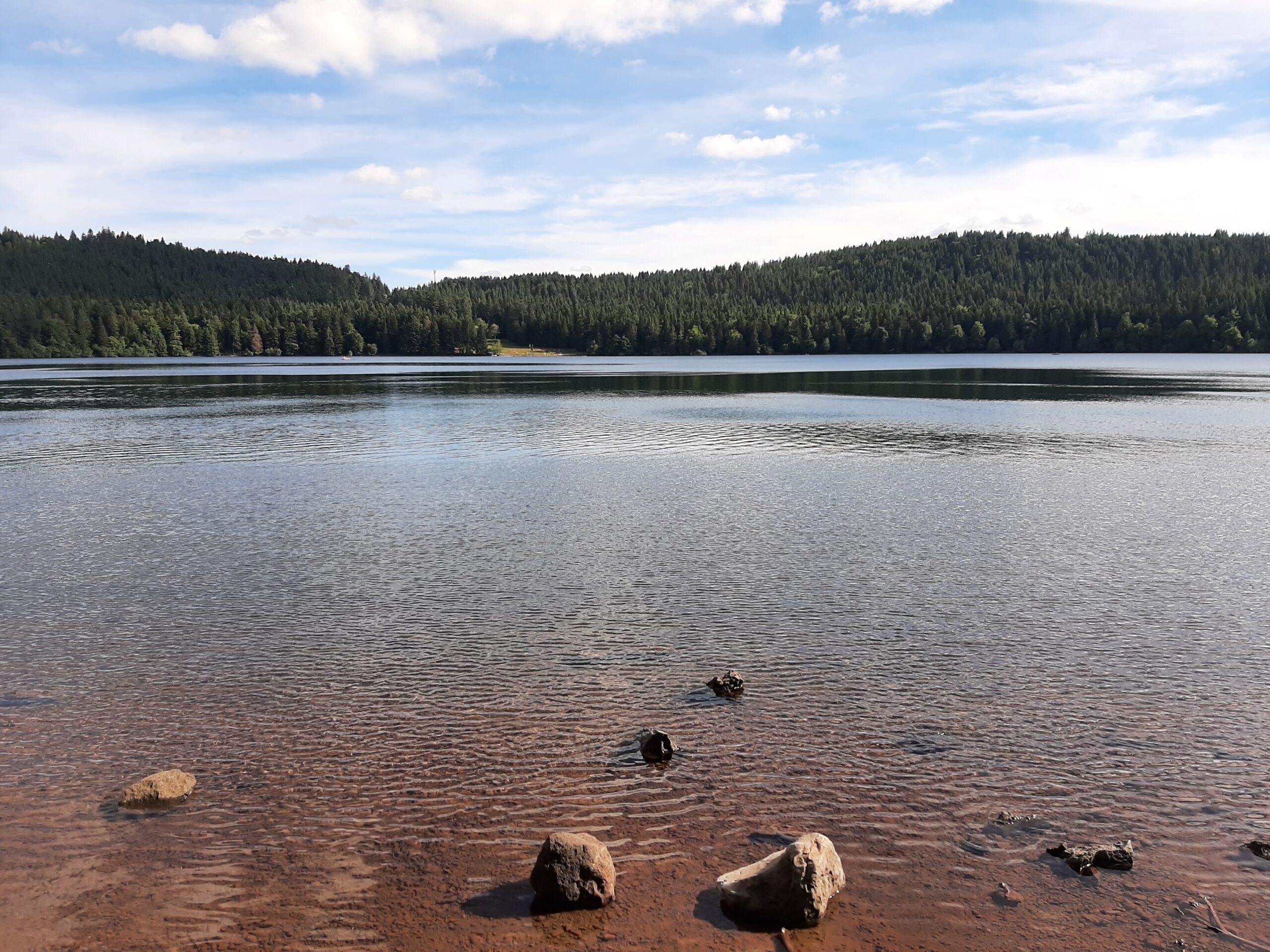 La traversée d’une forêt me permet de suivre quelques instants la source du Lot. À cet endroit, ce n’est qu’un mince filet d’eau, presque fragile, et celui-ci n’a rien à voir avec ce qu’il devient, le cours d’eau majestueux qui coule à Cahors, gonflé et renforcé tout au long de ses pérégrinations et méandres. Au détour d’un chemin, en sortant de cette forêt, s’est dévoilé le mont Lozère. Imaginant un mont isolé, délimité et précisément défini dans l’espace, je ne m’attendais pas à faire la rencontre d’une immense nef, massive et étalée sur des kilomètres.
