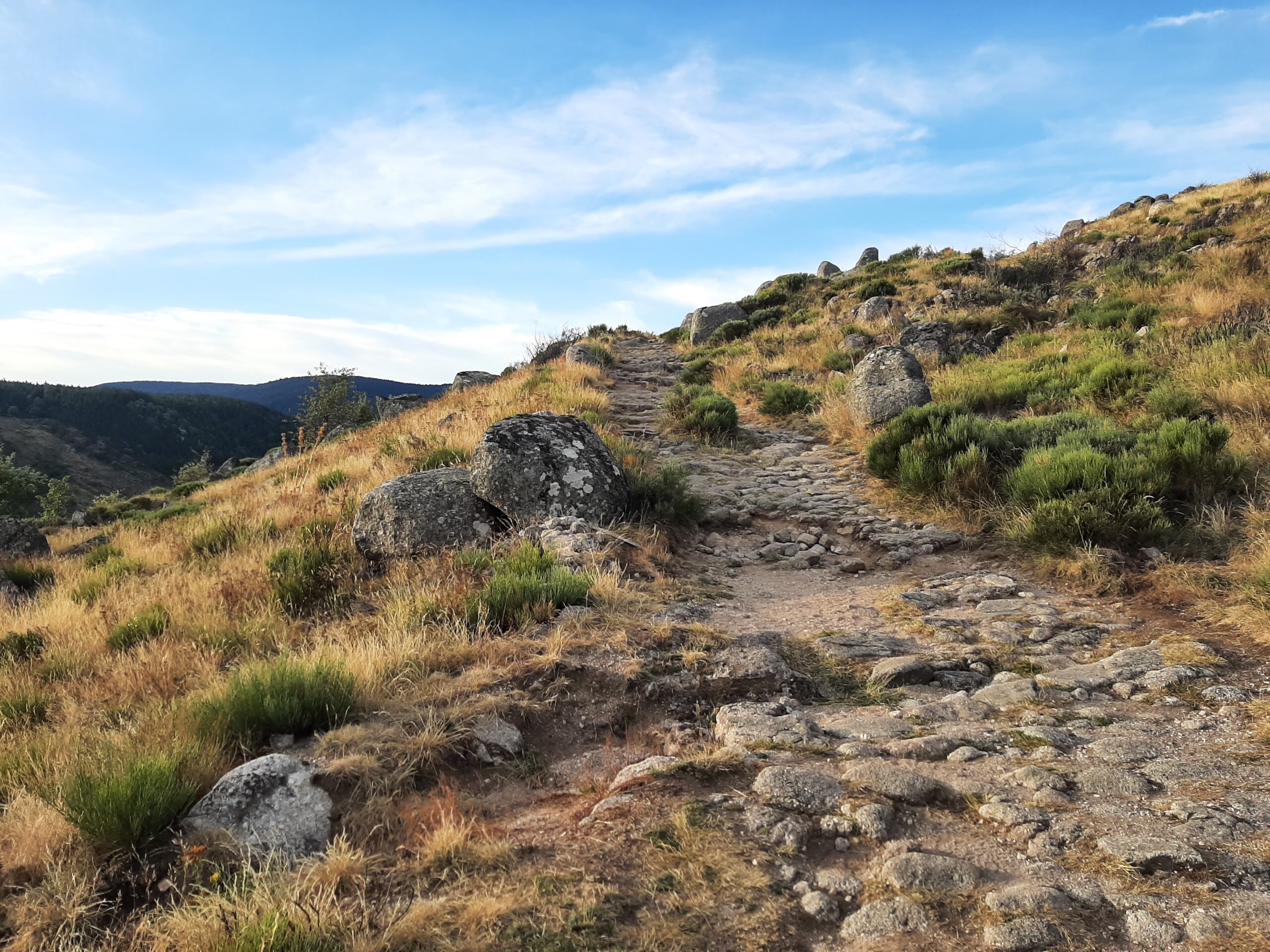 Durant la descente depuis le sommet, la vue est exceptionnelle : partout, ici et là, d’énormes blocs de pierre ornent la campagne et la plupart ont été tellement polis par les âges que certains arborent une forme sphérique. Certains, parmi ceux de taille moyenne, ont été utilisés pour former des murs et des clôtures. Le gris des rochers conjugué au blond des herbes forment un joli tableau, très pittoresque. Il est difficile de décrire ces paysages tellement ils sont beaux et variés. Le GR croise d’anciennes fermes en pierre dont les murs sont constitués d’énormes moellons et le toit paré avec des lauzes. Ces habitations ont un aspect simple et rustique, mais paraissent indestructibles.
