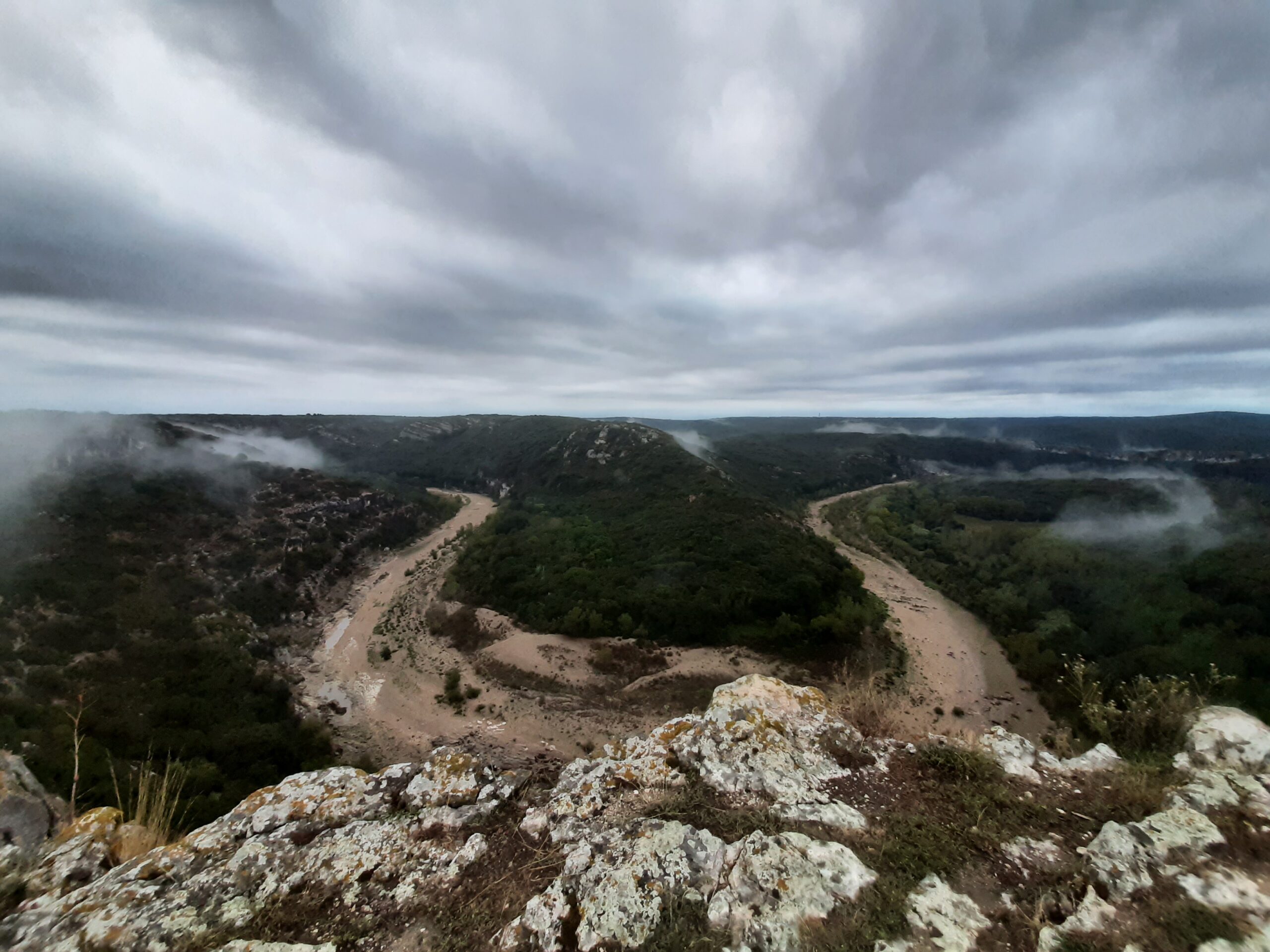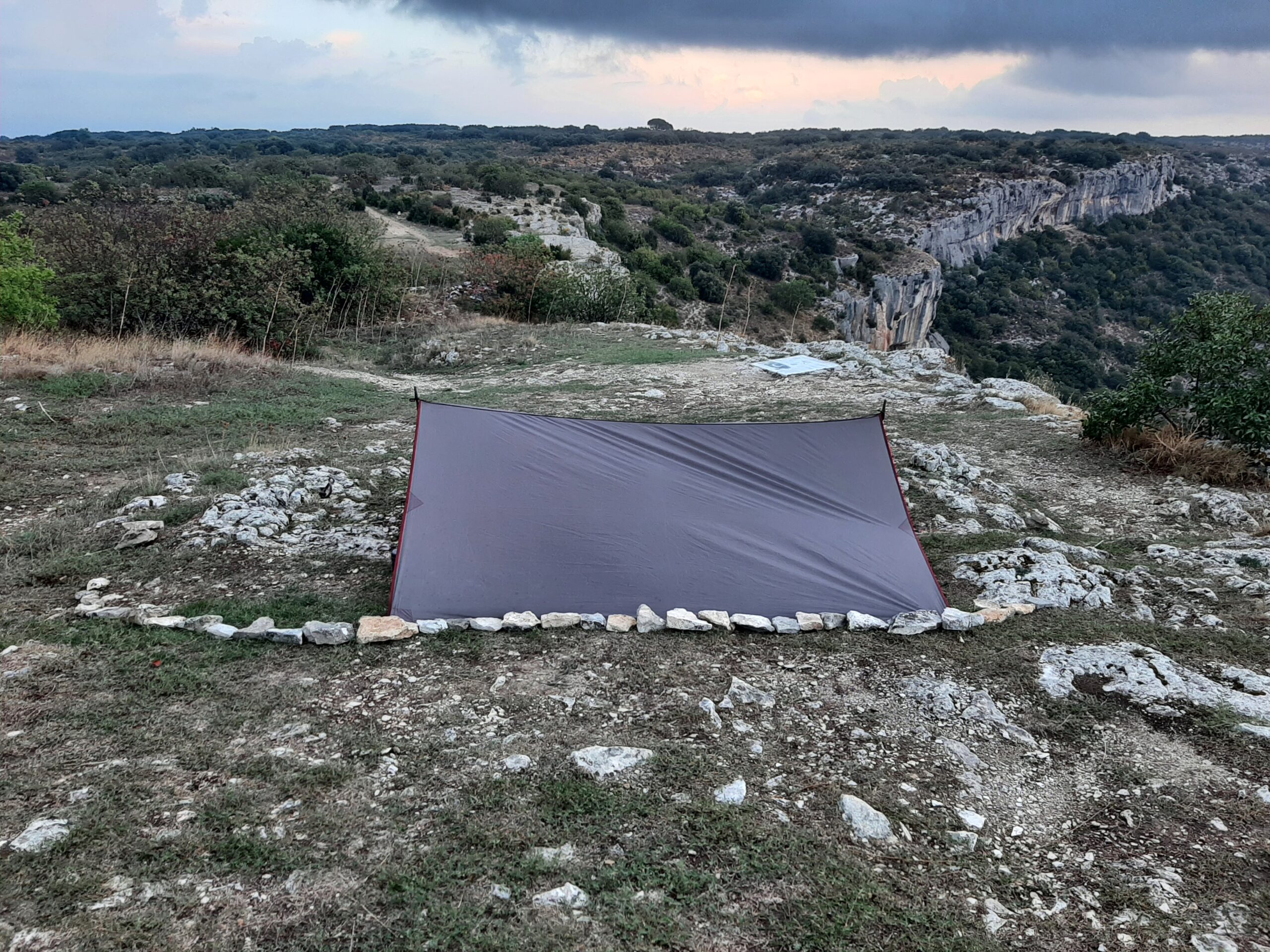 Arrivé à Russan (entre Alès et Nîmes), j’en profite pour monter dans les hauteurs afin de profiter de la vue sur les gorges du Gard (ou Gardon). La vue depuis le promontoire est très belle, on contemple le travail de l’eau sur la roche et le temps qu’il a fallu pour creuser près de 100 mètres de falaise. Le temps est couvert mais n’apparaît pas menaçant, j’en oublie complètement de regarder la météo pour la nuit. Sans quoi j’aurais vu que Météo France avait émis une alerte rouge sur le département du Gard… Je me hâte de monter mon tarp et de bâtir un muret en grosses pierres afin de dévier les éventuelles eaux de pluie. Après m’être assuré de disposer d’un abri résistant avec peu de prise au vent, un sentiment étrange m’assaille lors de mon dîner. Je me sens stressé, la boule au ventre et je mets un certain temps à comprendre que la cause réside dans le fait de vouloir bivouaquer sur les hauteurs malgré le temps extrêmement lourd et orageux depuis plusieurs jours déjà, ainsi qu’un ciel couvert. Dans ces conditions, je me donne la liberté de quitter mon bivouac pour rejoindre le village en cas d’orage violent. À cette fin, je planifie de ranger mon sac et placer mes affaires sensibles dans les sacs étanches.