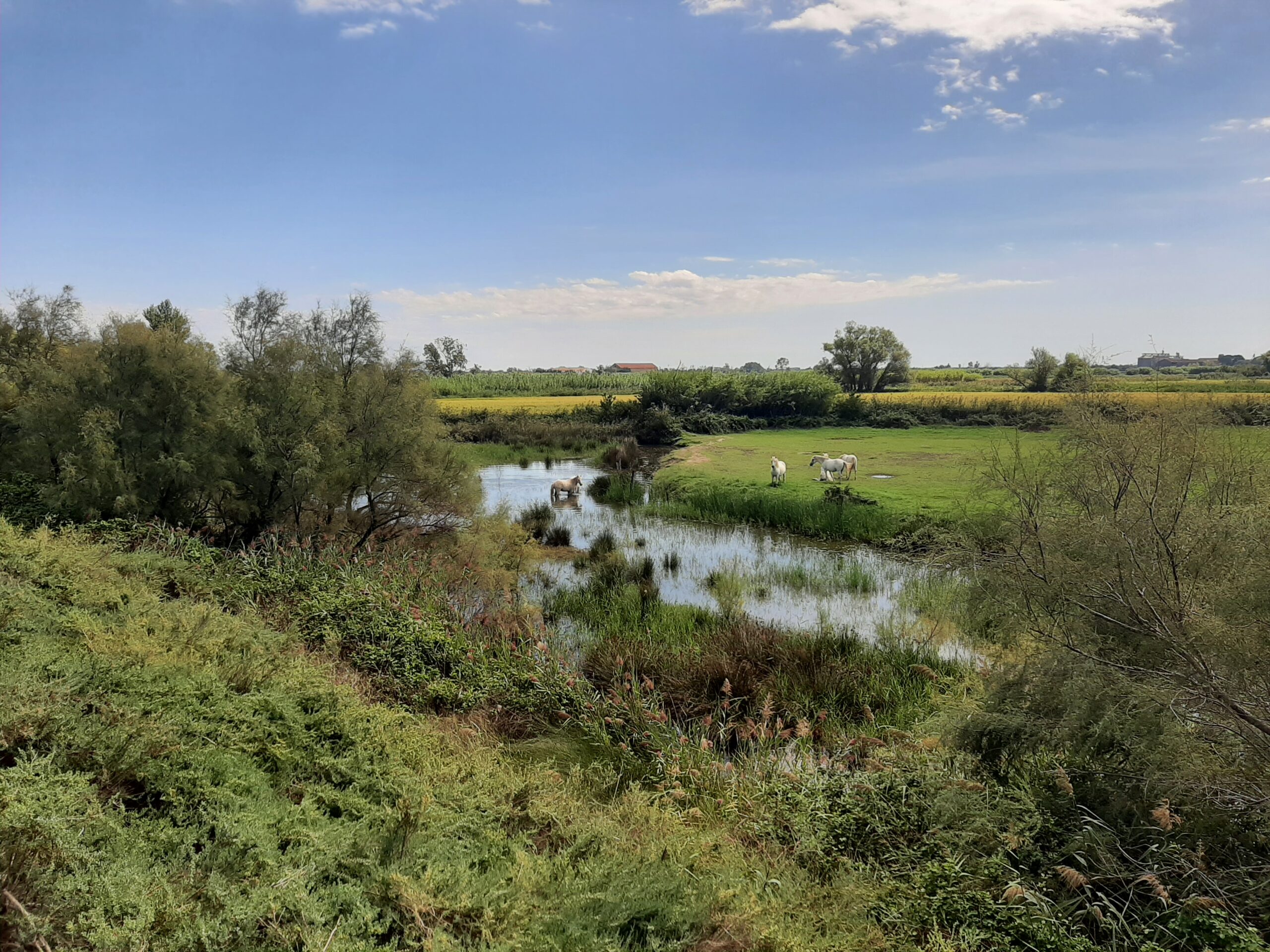 Enfin, la Camargue s’ouvre à l’approche de Saint-Gilles-du-Gard. D’elle, je ne verrai pas grand chose, excepté ici et là où des trouées me permettent d’être le spectateur, comme ici sur l’ancienne voie de train entre Saint-Gilles et Arles d’un combat opposants deux boucs d’un même troupeau de chèvres sans doute sauvages. Sur la même voie de chemin de fer, une trouée s’entrouvre et me laisse apercevoir un tableau splendide de chevaux camarguais. Ou encore ces graminées que j’ai mis du temps à identifier : le fameux riz de Camargue.