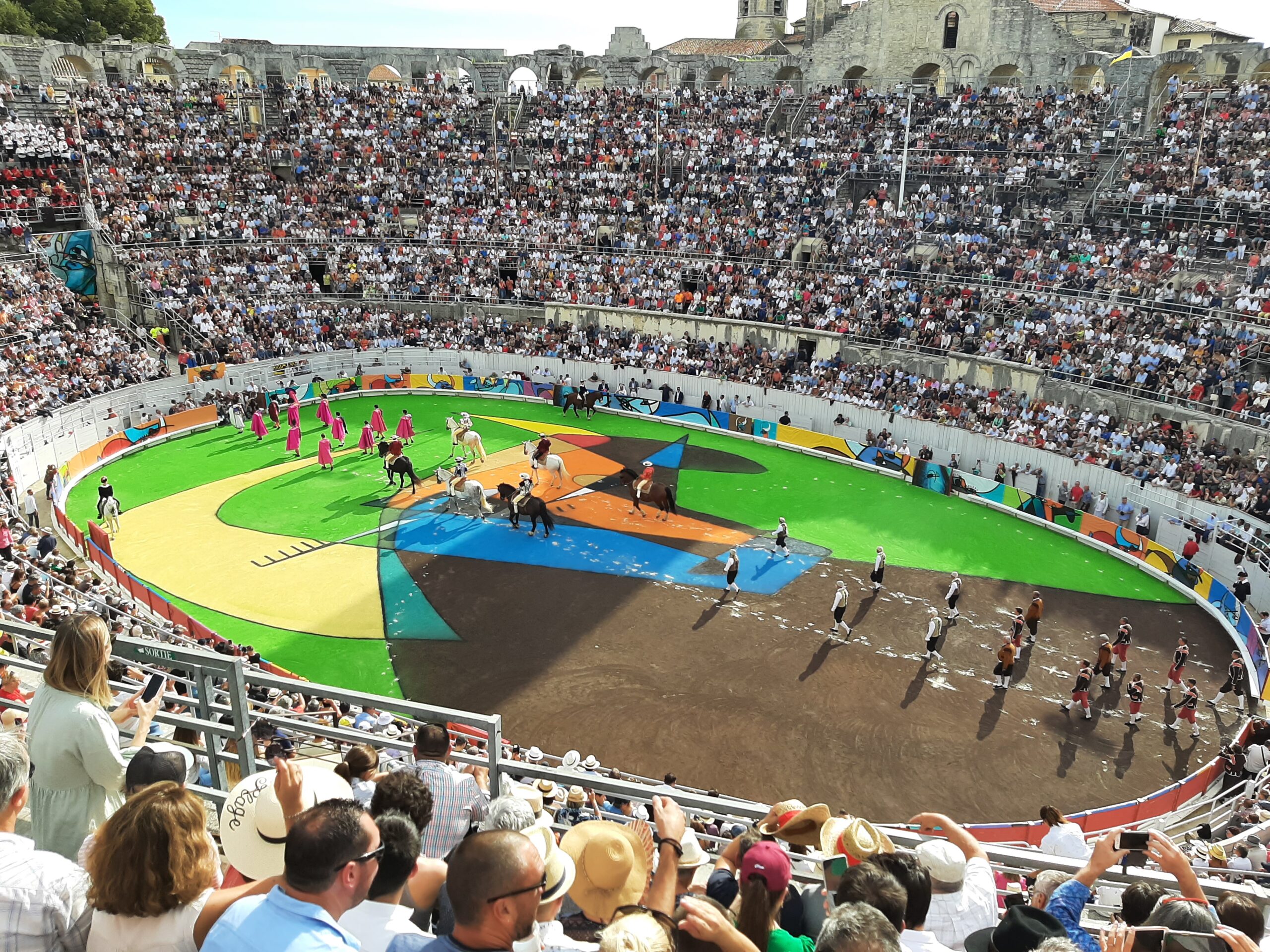 Bien qu’Arles consitue la dernière étape de mon itinéraire entamé au Puy-en-Velay, une surprise, de taille, m’attendait pour clôturer d’une belle manière ces trois semaines. En effet, mon entrée dans la ville coïncidait avec le week-end de la féria du riz, féria pendant laquelle différents événements avaient lieu : abrivado, corridas et novilladas dans les arènes. Afin de découvrir ce qu’était une corrida, j’avais donc décalé mon retour au lendemain. La corrida à laquelle j’ai assisté était une corrida goyesque, c’est-à-dire que le sable de l’arène était peint et il y avait un ensemble formé d’un orchestre et de chanteurs lyriques pour accompager le travail des toreros. Cette année, c’est l’artiste Belin qui a dessiné l’œuvre monumentale tronant sur le sable. Très moderne et déstructurée, à la façon de Picasso ou Miró.