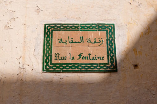 Une plaque de rue dans le quartier des Habous à Casablanca, tout à côté du Palais Royal. Cette nouvelle médina a été construite dans les années 20 durant…