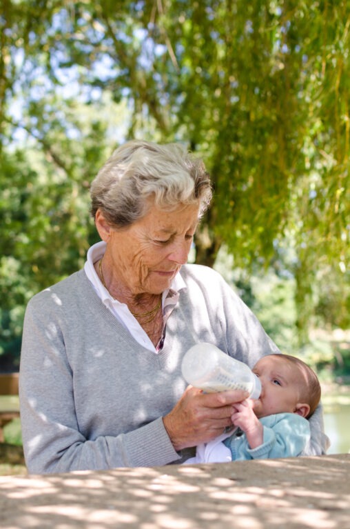 Un pique-nique au bord de Loire durant nos traditionnelles vacances familiales. Ma grand-mère donne le biberon à sa première arrière-petite-fille : 82 ans les séparent !