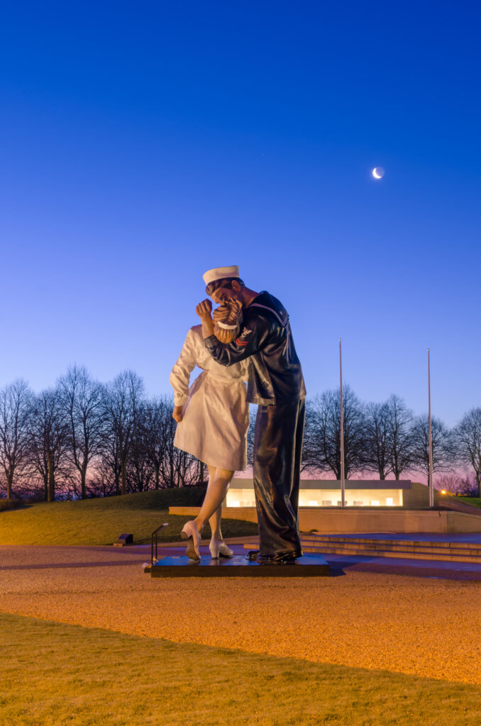 Dans le cadre du 70e anniversaire du Débarquement, The Kiss, la statue de l’artiste américain Seward Johnson a été installée devant le Mémorial de Caen de septembre 2014…